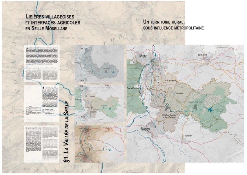 Observer l’évolution des lisières villageoises au fil de la vallée de la Seille, et plus généralement l’organisation spatiale de la production agricole. Cet objectif s’est progressivement élargi à l’observation de l’évolution des structures morphologiques et paysagères villageoises, et à l’exploration d’autres interfaces entre ces deux mondes, plus immatérielles, en termes d’échanges et de représentations notamment autour de la question des services de proximité.